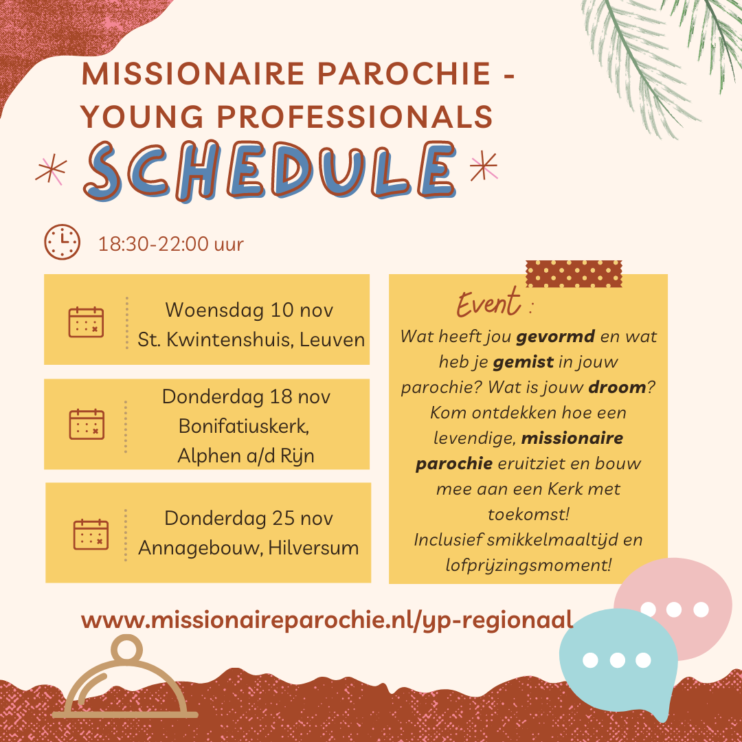 Ter voorbereiding op de bijeenkomsten voor young professionals op 22 januari en 5 maart zijn er doorheen het Nederlands taalgebied de komende periode een aantal regionale avonden vanuit De Missionaire Parochie. Avonden om na te denken over wat jou heeft gevormd in het geloof of wat je juist hebt gemist, waar je van droomt voor de parochie en hoe je daar eventueel al aan bijdraagt. Uiteraard is er input over hoe ziet een missionaire parochie er uit en hoe bouwen we daar aan mee.